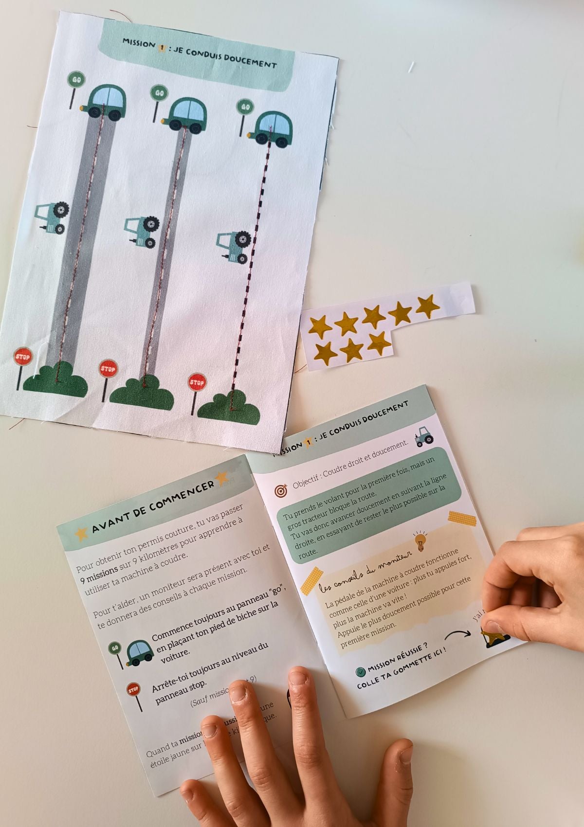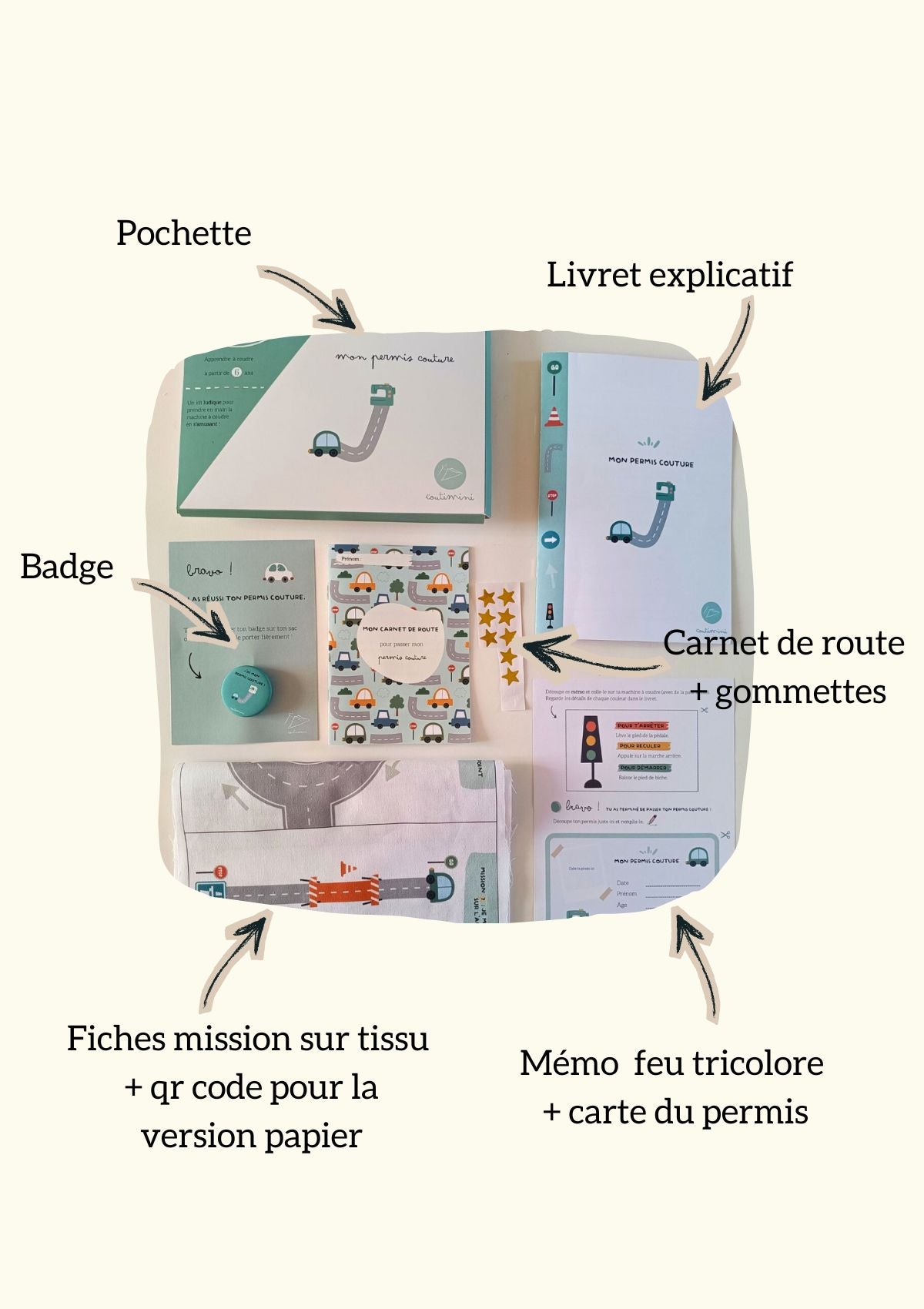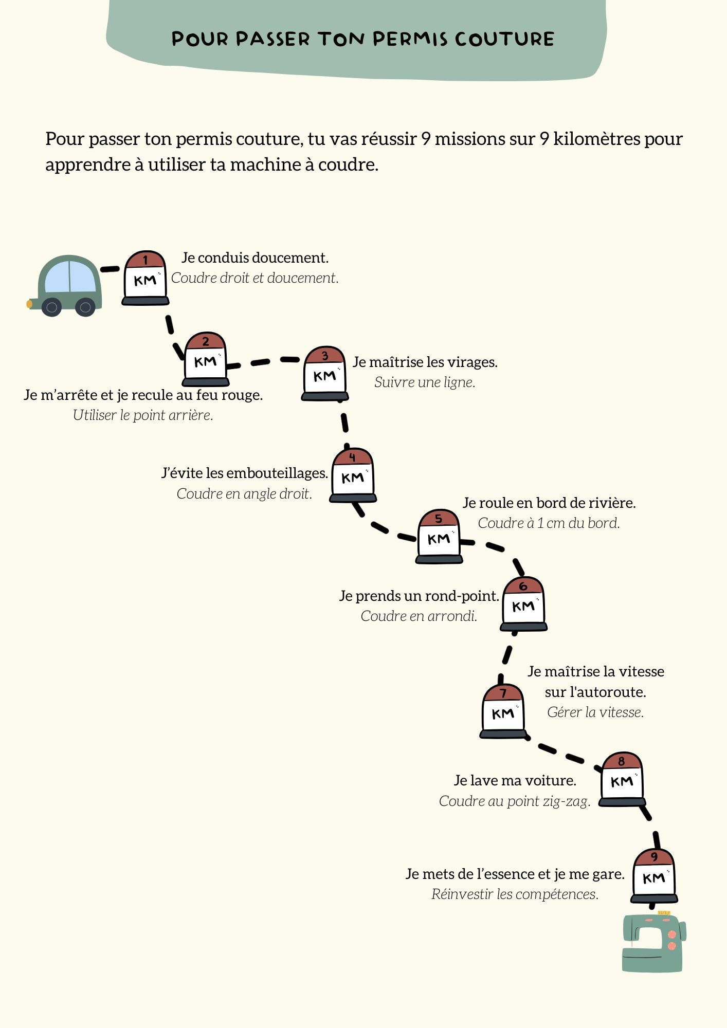 Avec ce kit couture « mon permis couture », votre enfant va apprendre les bases de la couture et prendre en main sa machine à coudre en s'amusant, en comparant la machine à coudre à une voiture.
