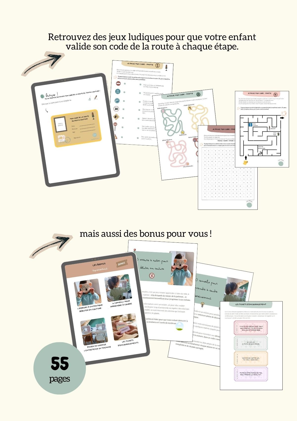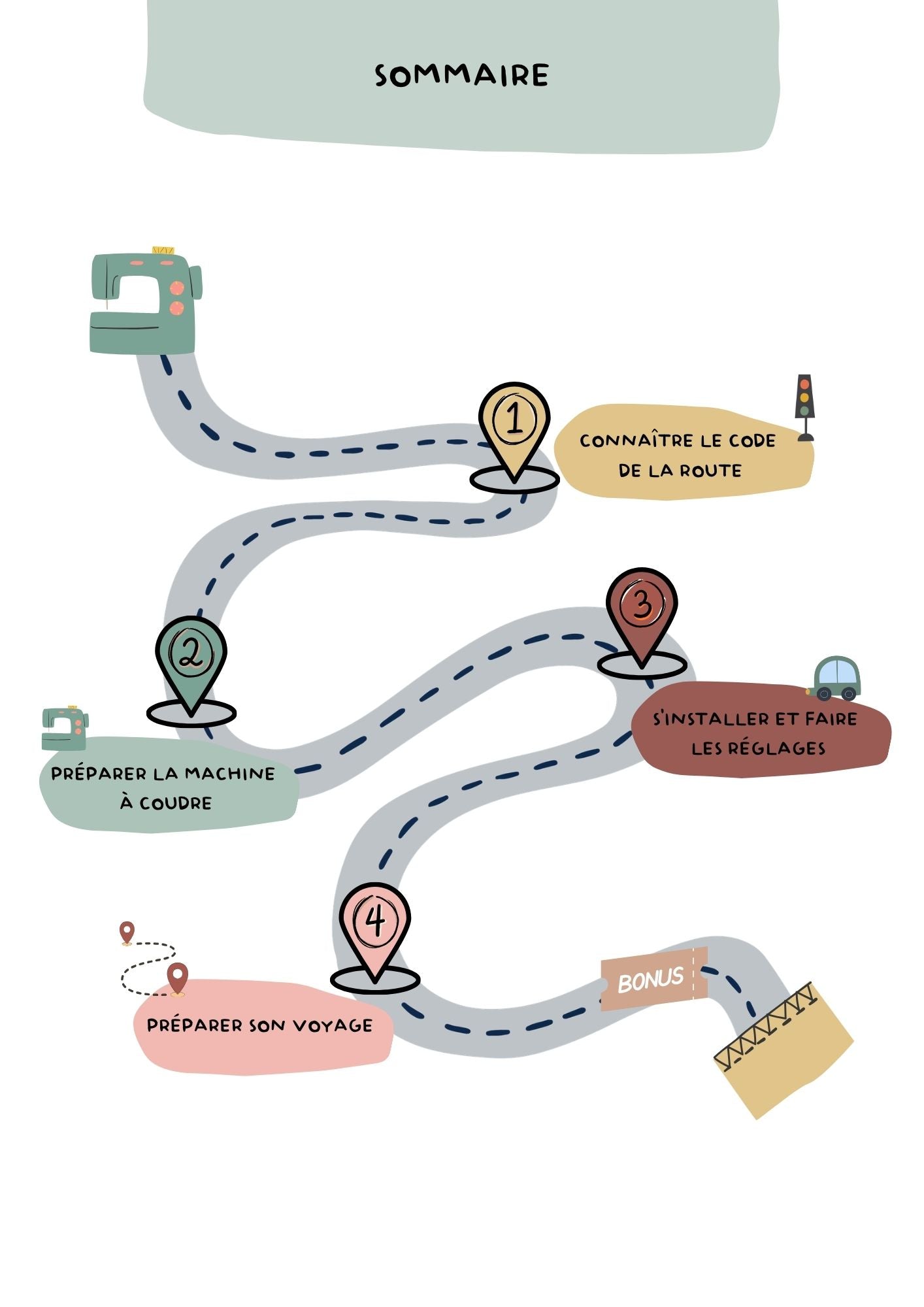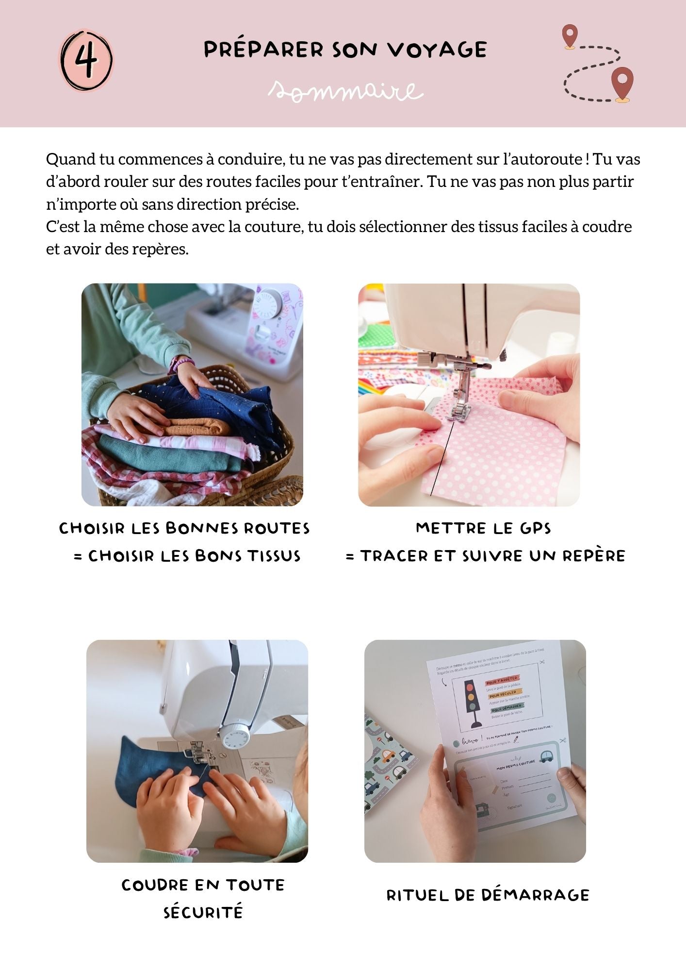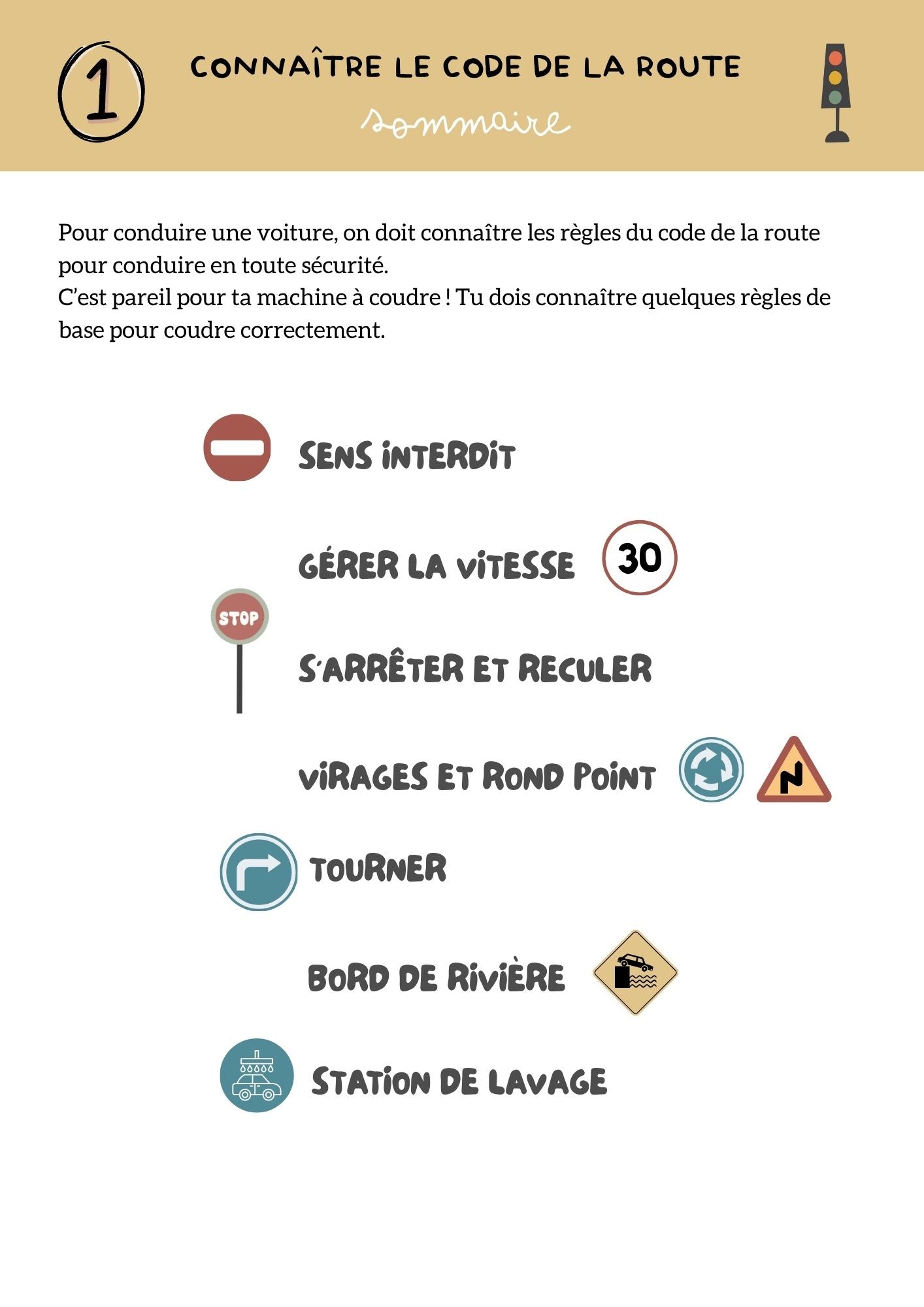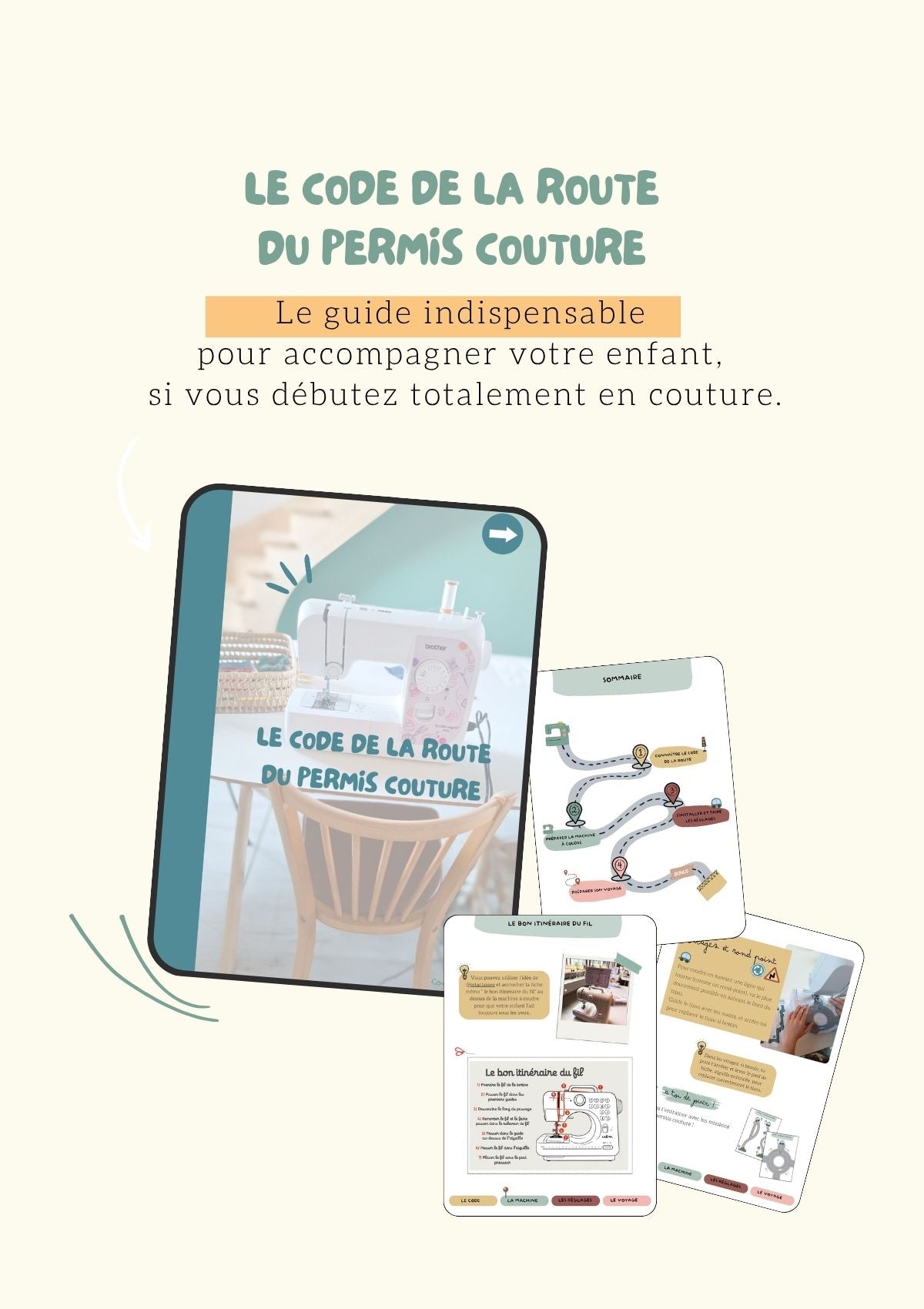 Le code de la route du permis couture est un fichier de 55 pages qui va vous permettre de connaître et comprendre la machine à coudre et les “règles” de base en couture avant de vous lancer avec votre enfant.