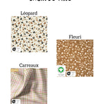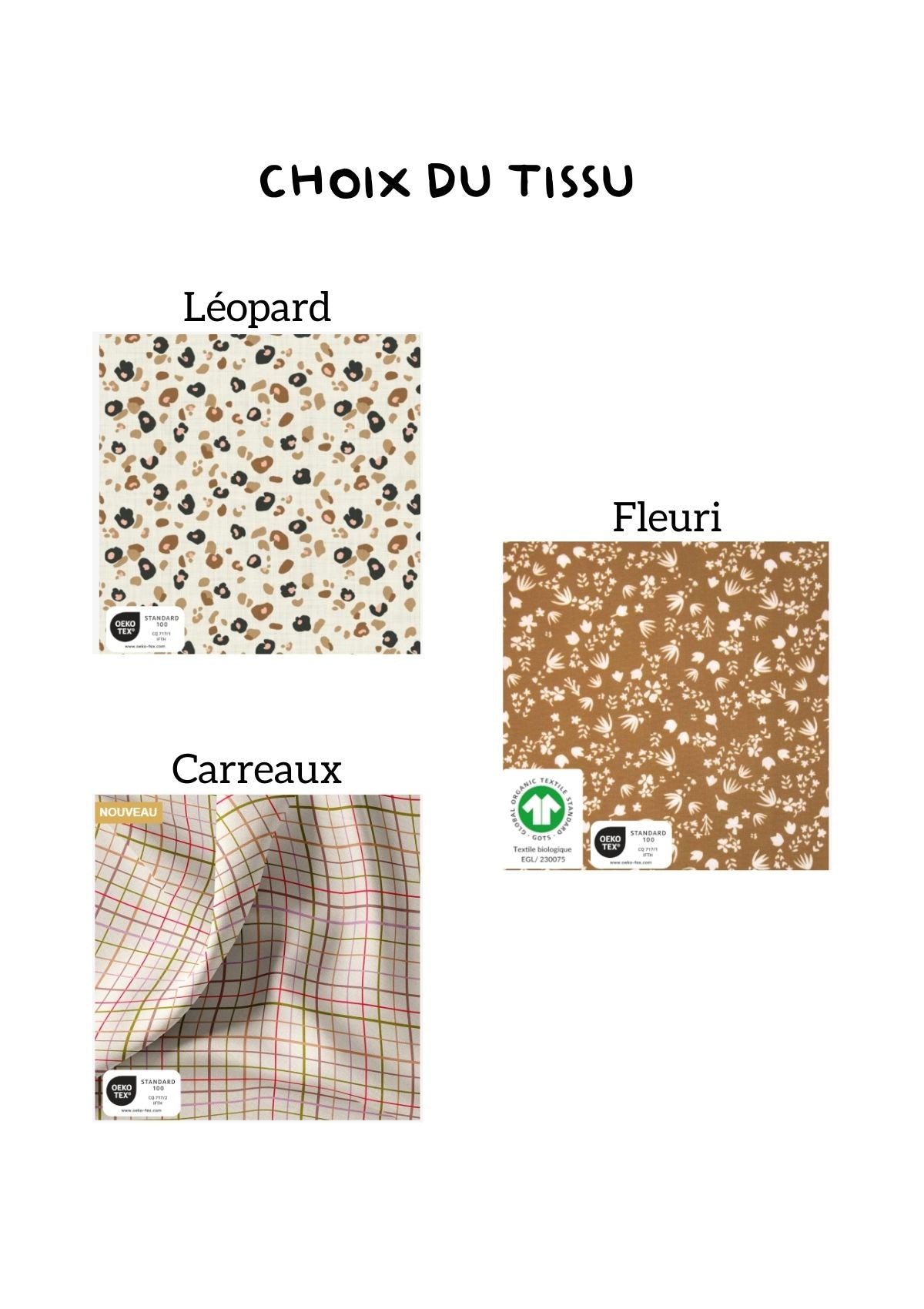 - Le tissu léopart, fleuri ou carreaux: coton Oeko tex (sans substances nocives pour la peau)