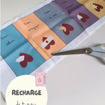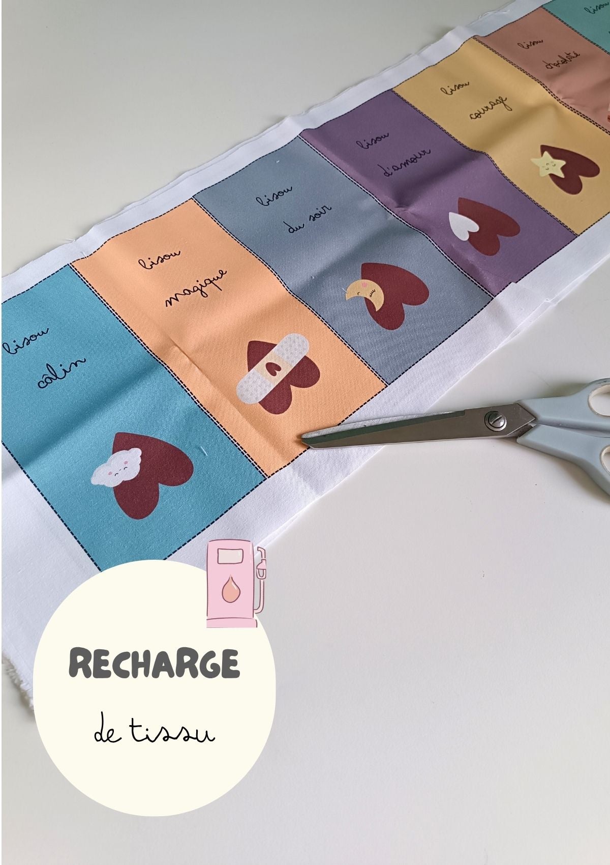Découvrez la recharge de tissus pour que votre enfant puisse coudre d'autres mini-coussins bisous et son pochon, facilement grâce au tissu pré-tracé.